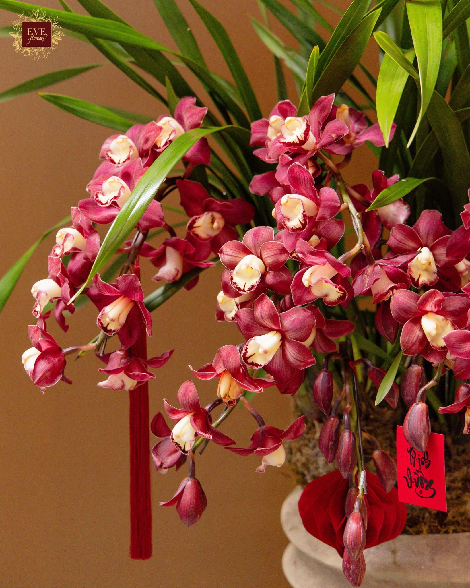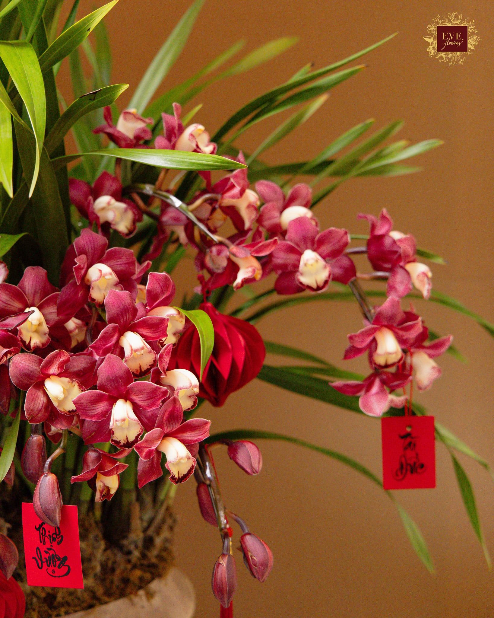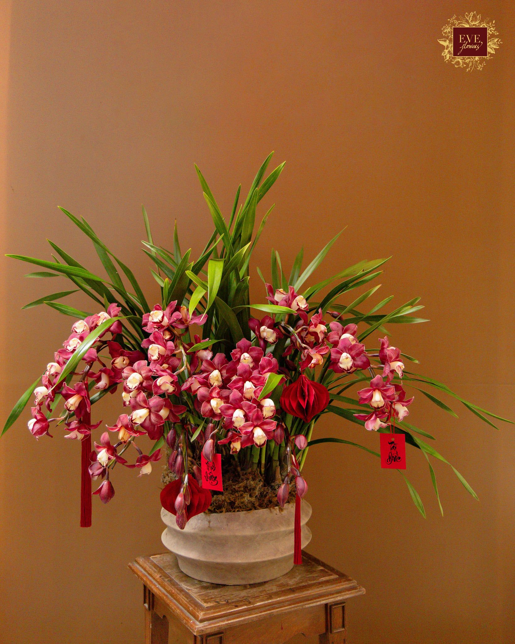 Sản phẩm được thiết kế từ địa lan kết hợp cùng nhiều loại cây xanh và phụ kiện trang trí, tạo tổng thể hài hòa và sang trọng.