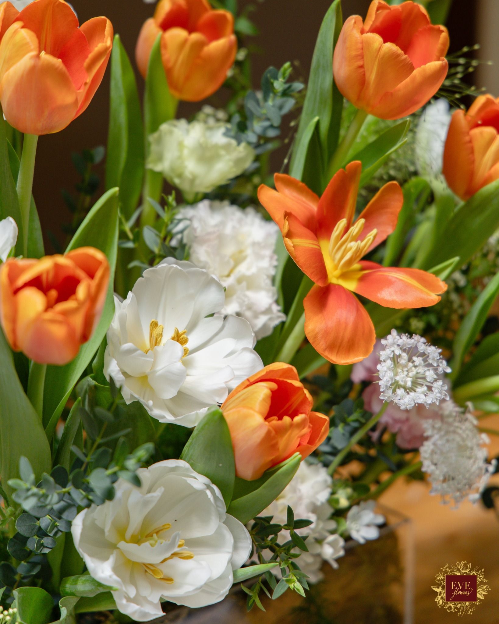 Sản phẩm được thiết kế từ tulip Hà Lan và các loại hoa lá phụ.