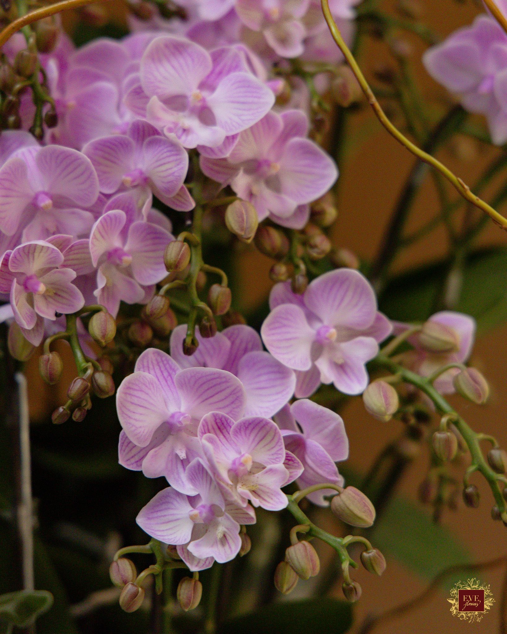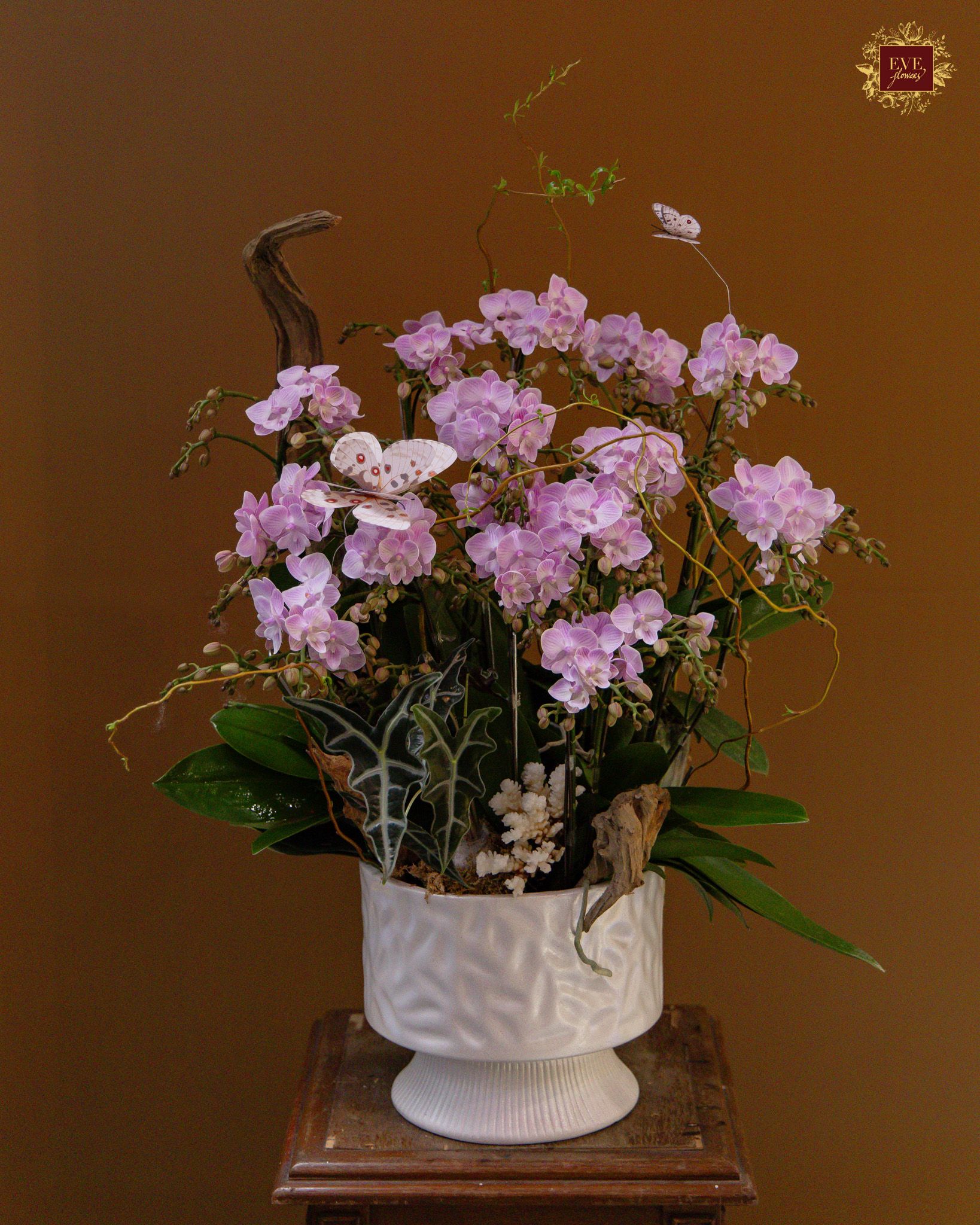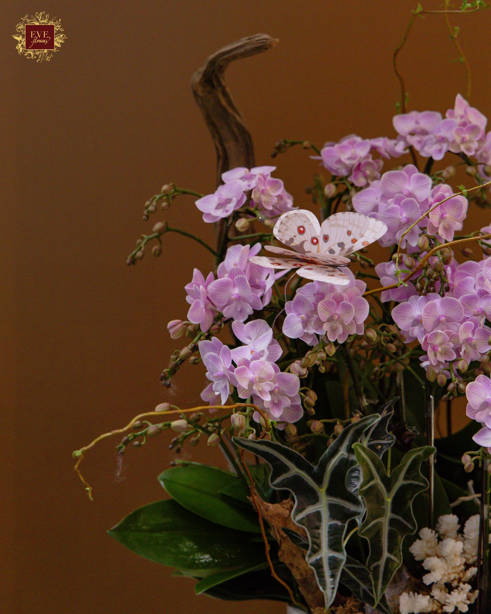 Sản phẩm gồm lan hồ điệp kết hợp cây xanh và phụ kiện trang trí, được thiết kế hài hòa và độc đáo.
