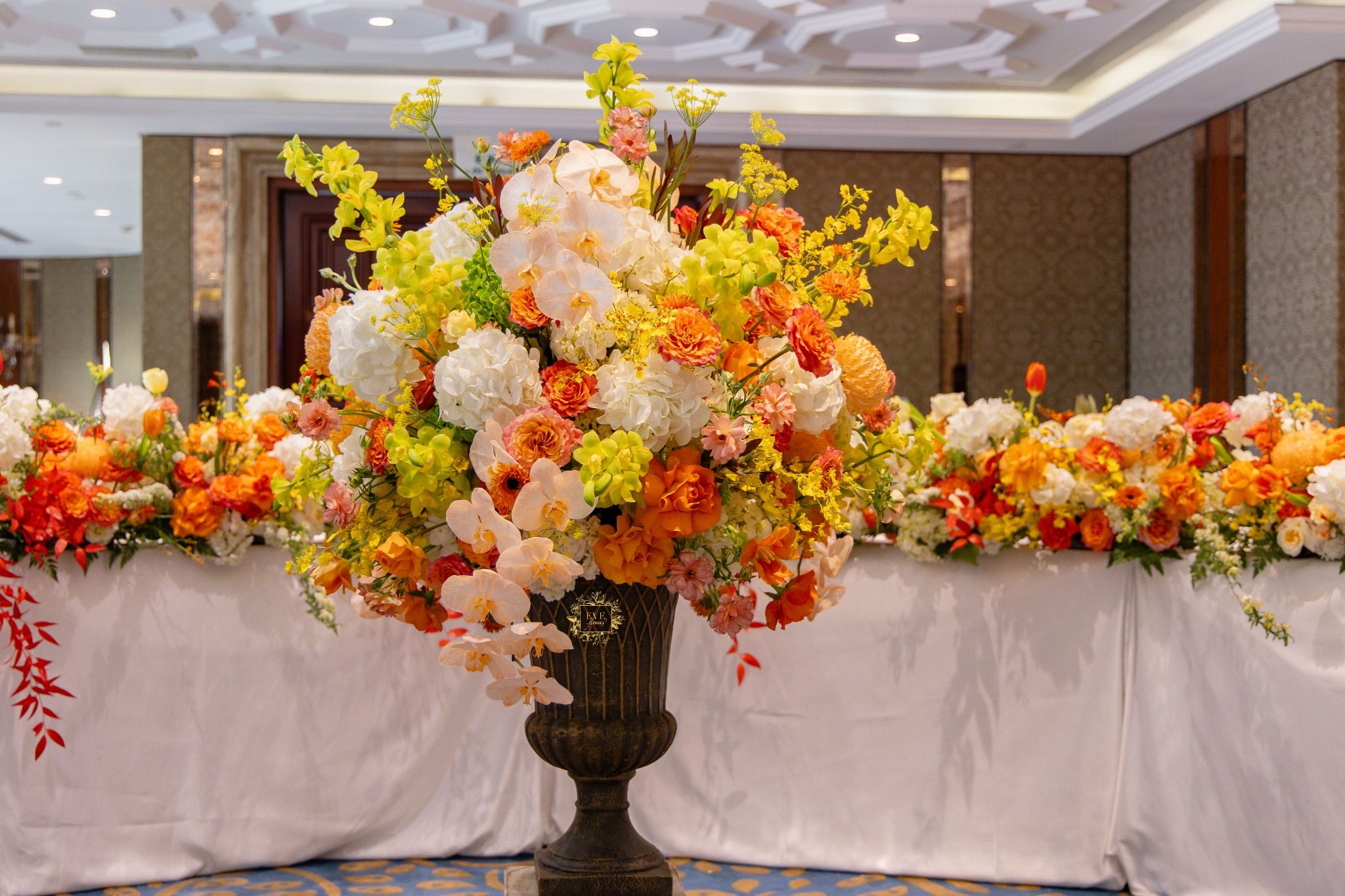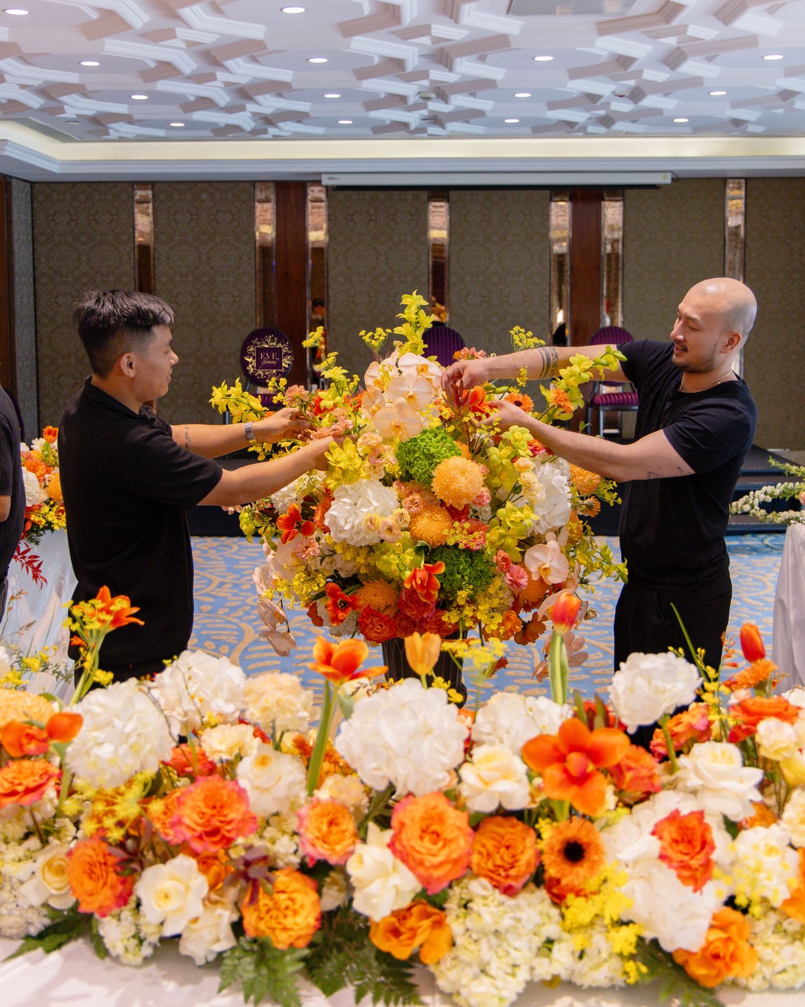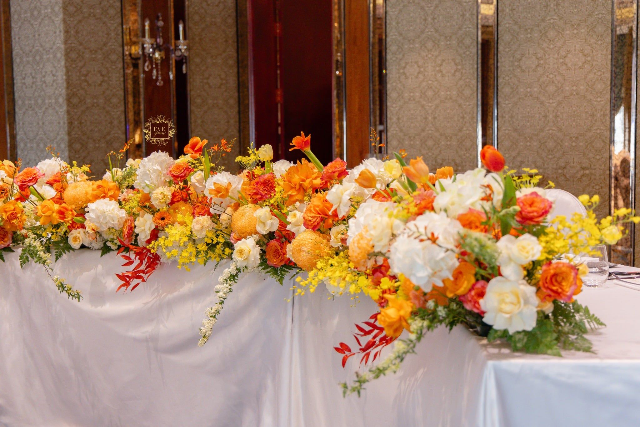 Bữa tối riêng tư được thiết kế trong không gian sang trọng kết hợp với sự hài hoa của sắc vàng - cam - trắng, nơi hoa và ánh sáng hòa quyện tạo nên một trải nghiệm đẳng cấp, ấm áp và đầy tính nghệ thuật.
