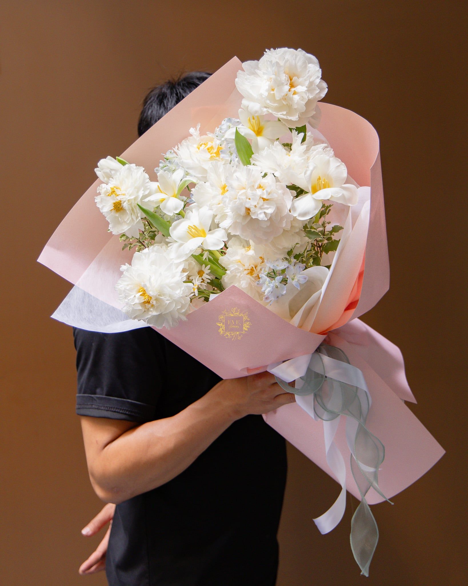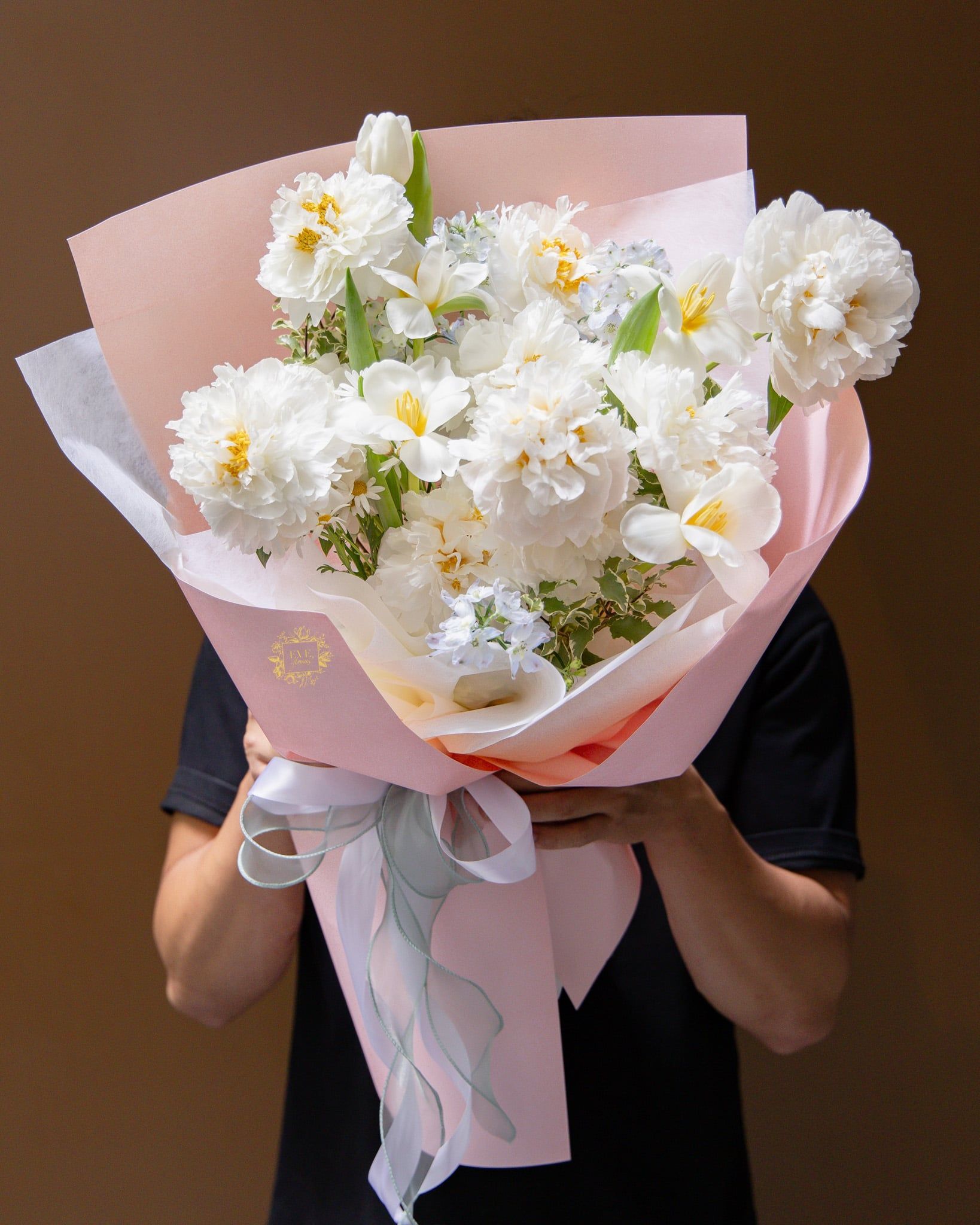 Bó hoa kết hợp giữa hoa Mẫu Đơn và hoa Tulip trong tông trắng mang vẻ đẹp tinh khôi và đầy chiều sâu. Những cánh mẫu đơn nở tròn mền mại hòa cùng dáng tulip thanh thoát, tạo nên tổng thể nhẹ nhàng và toát nên sự sang trọng.