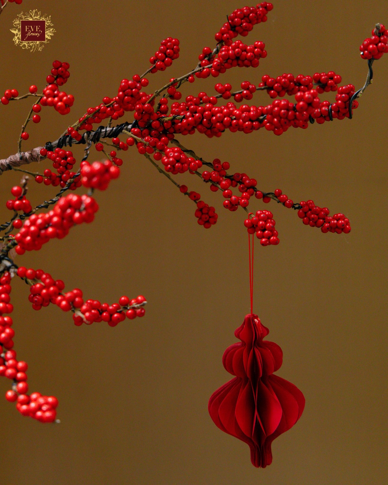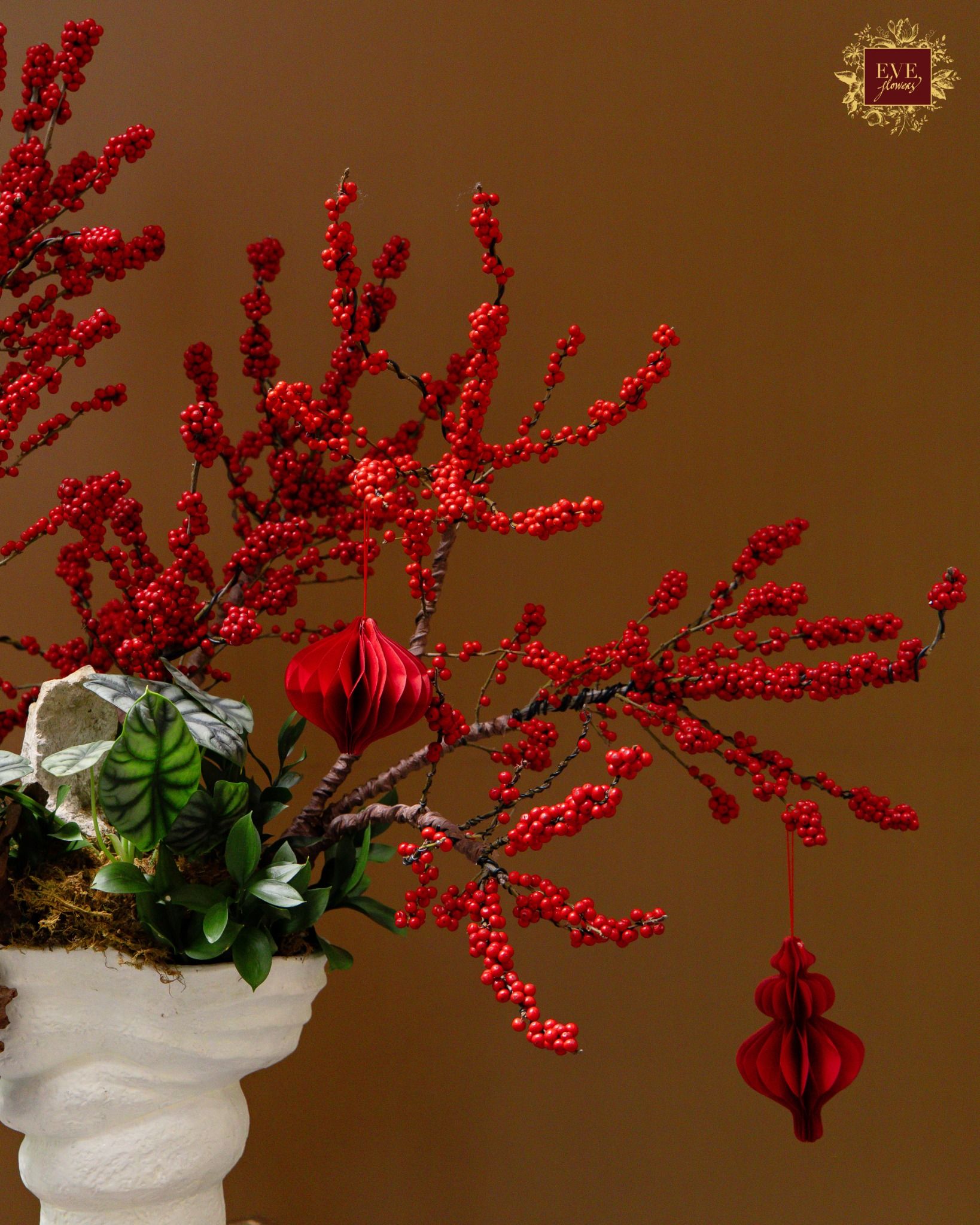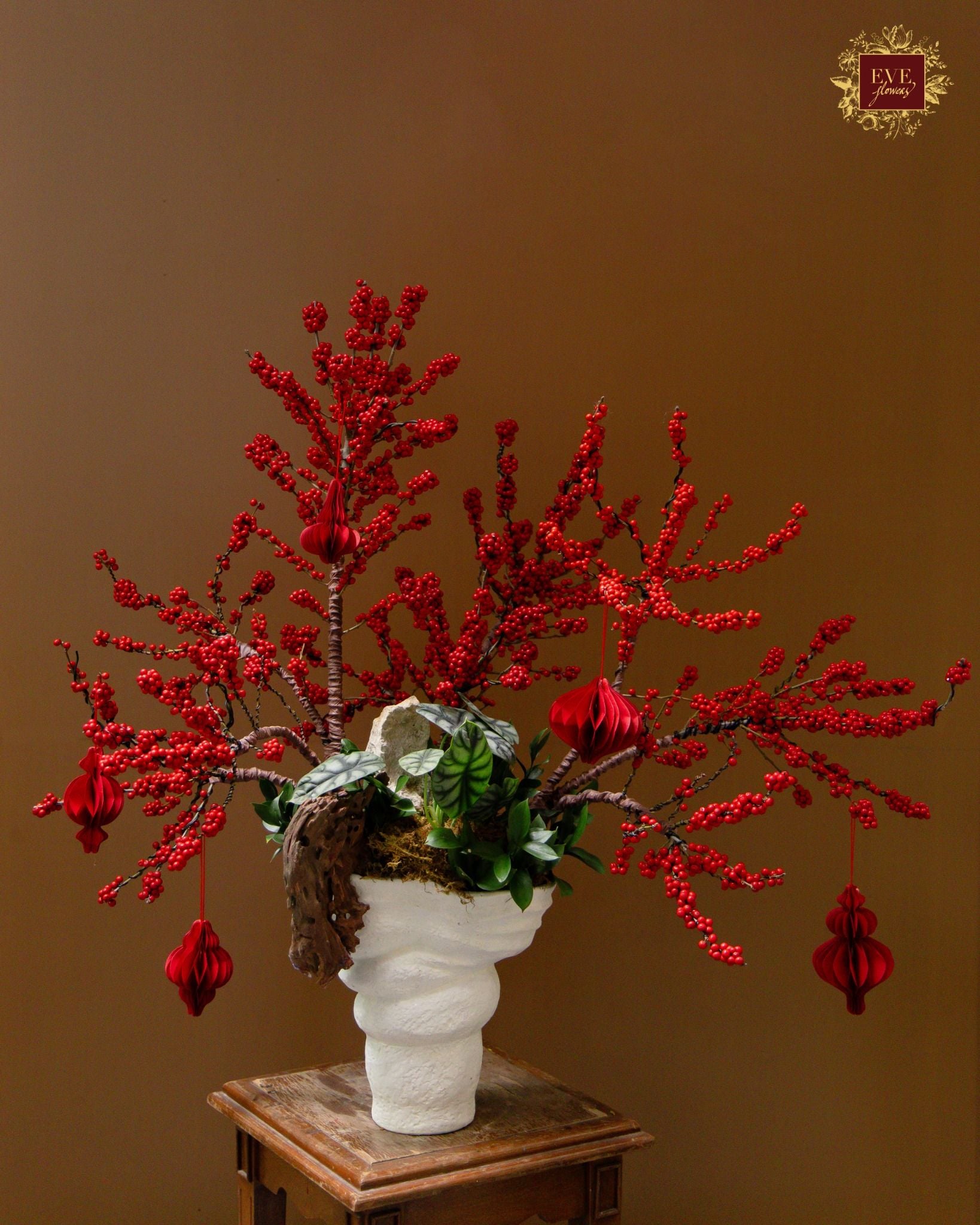Sản phẩm được tạo hình từ đào đông đỏ, thiết kế theo kiểu dáng bonsai, mang vẻ đẹp vững chãi, sinh động và không khí xuân ấm ấp